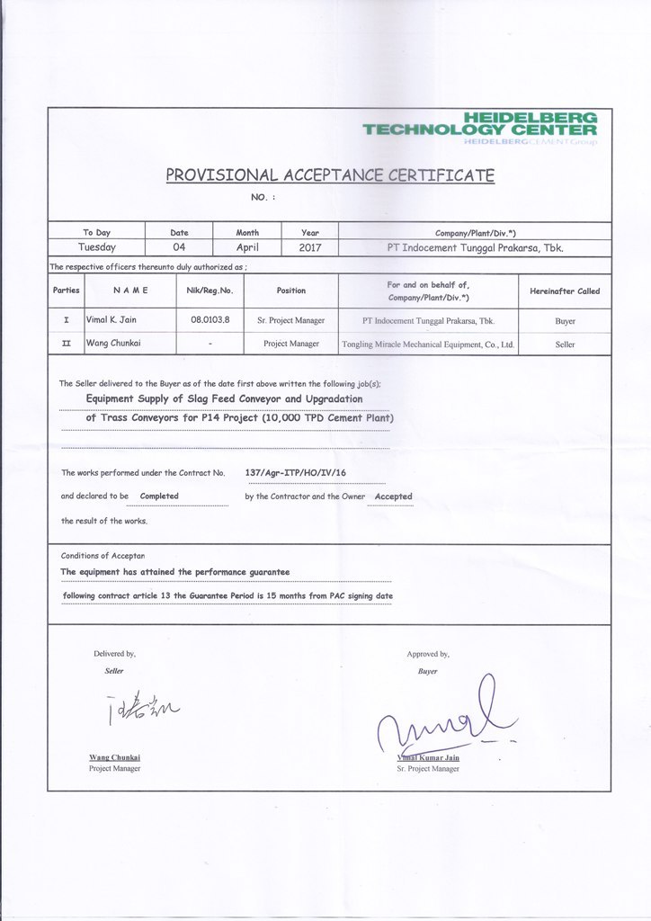 2017年4月在印尼PT Indocement Tunggal Prakarsa, Tbk項目的現場成功試車運行并且得到業主方的認可。與同年5月,我公司收到了業主方和安裝方現場簽署的現場合格驗收證明,證明我公司供貨的皮帶機設備各方面性能運行良好。